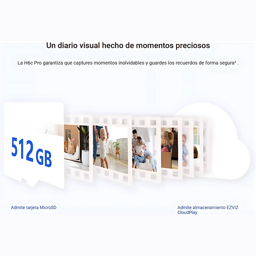 • Soporte para tarjeta microSD de hasta 512 GB para grabación local sin suscripciones.