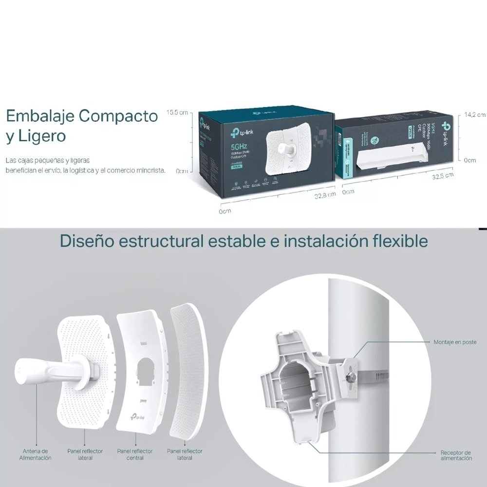 • Soporte PoE pasivo: Permite alimentar el dispositivo y transmitir datos a través de un solo cable Ethernet.