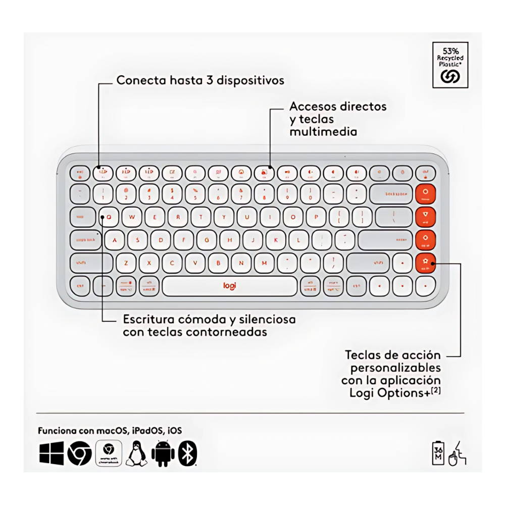 • Diseño retro con teclas redondas estilo máquina de escribir y colores vibrantes blanco con naranja