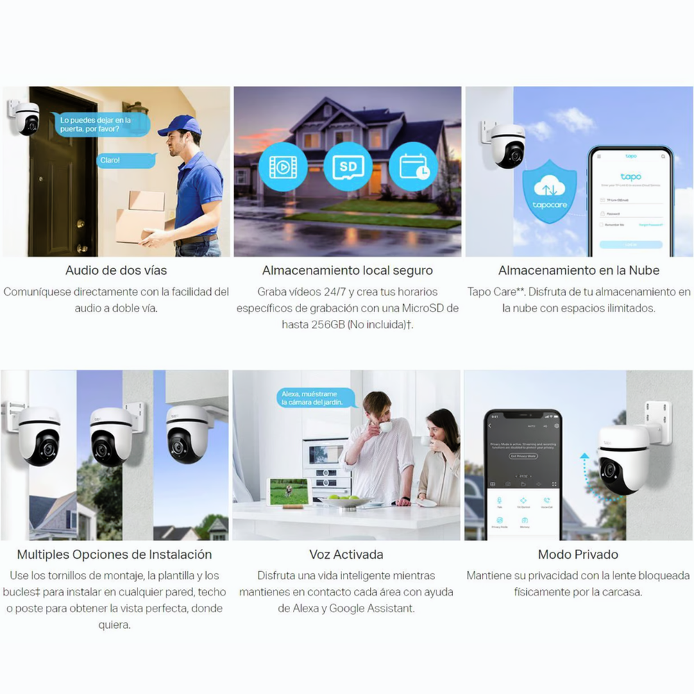 • Almacenamiento flexible: Guarda grabaciones en tarjeta microSD o en la nube con Tapo Care.