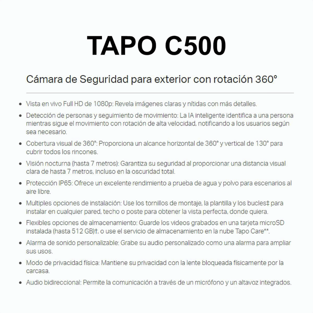 • Almacenamiento en tarjeta microSD (hasta 512 GB) o nube Tapo Care
