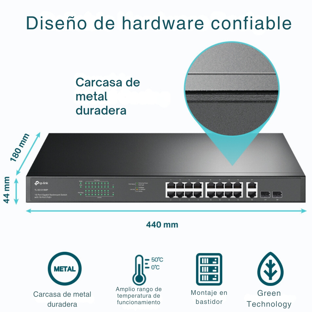 • PoE+ de alta capacidad: Alimenta y conecta hasta 16 dispositivos como cámaras IP, puntos de acceso y teléfonos VoIP sin necesidad de cableado eléctrico adicional.