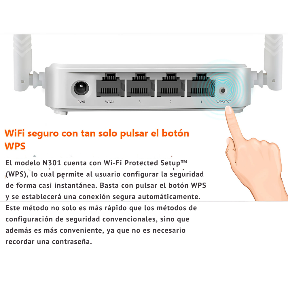 • Botón WPS integrado: Conecta tus dispositivos de forma rápida y segura sin necesidad de ingresar contraseñas.