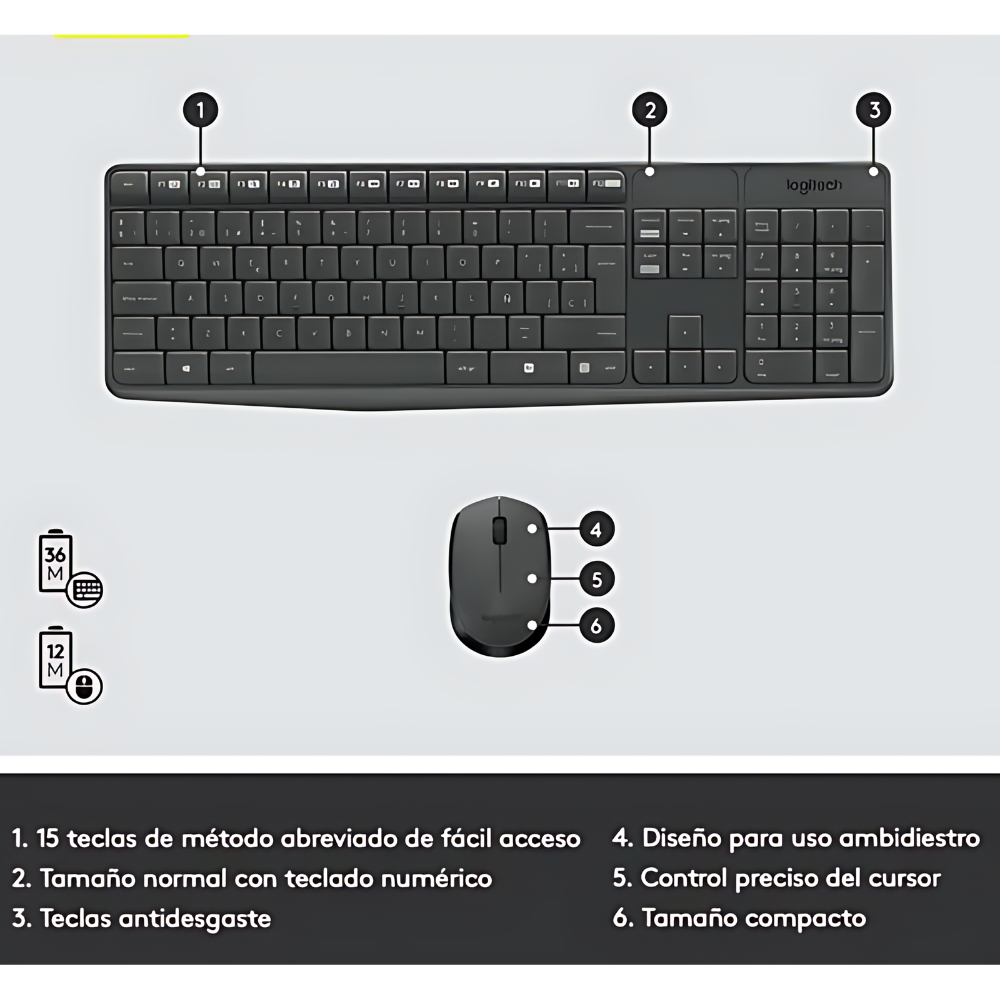 • Autonomía prolongada: hasta 36 meses en teclado y 12 meses en mouse