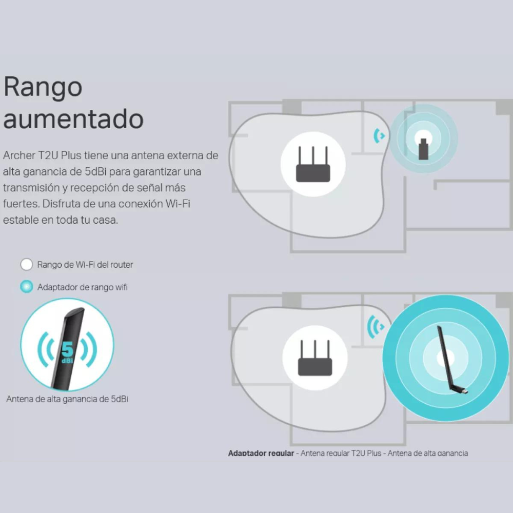 • Wi-Fi AC600 de Banda Dual: Hasta 433 Mbps en 5 GHz y 150 Mbps en 2.4 GHz para conexiones rápidas y estables.