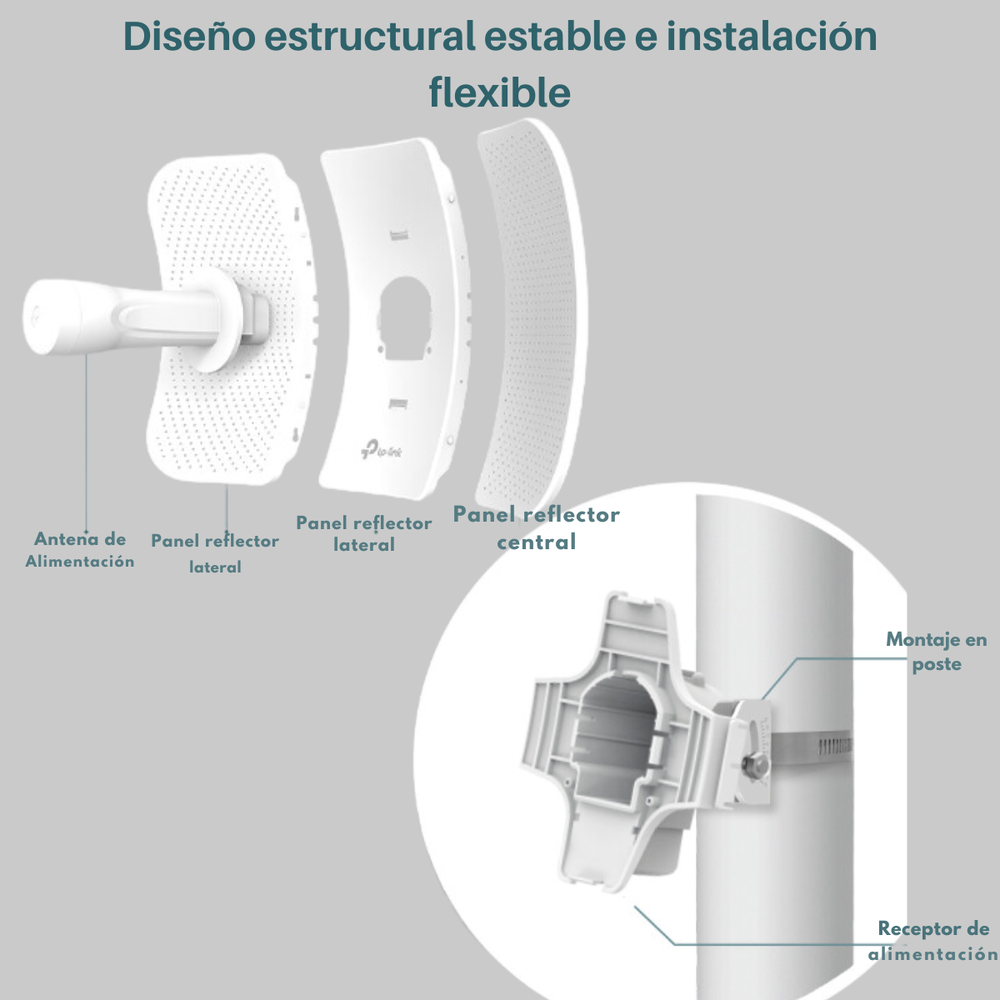 • Soporte PoE pasivo: Permite alimentar el dispositivo y transmitir datos a través de un solo cable Ethernet.