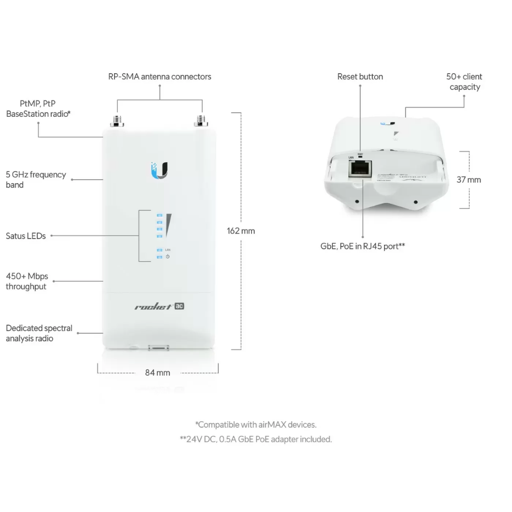 • Compatible con antenas RocketDish y sectoriales de la serie airMAX
