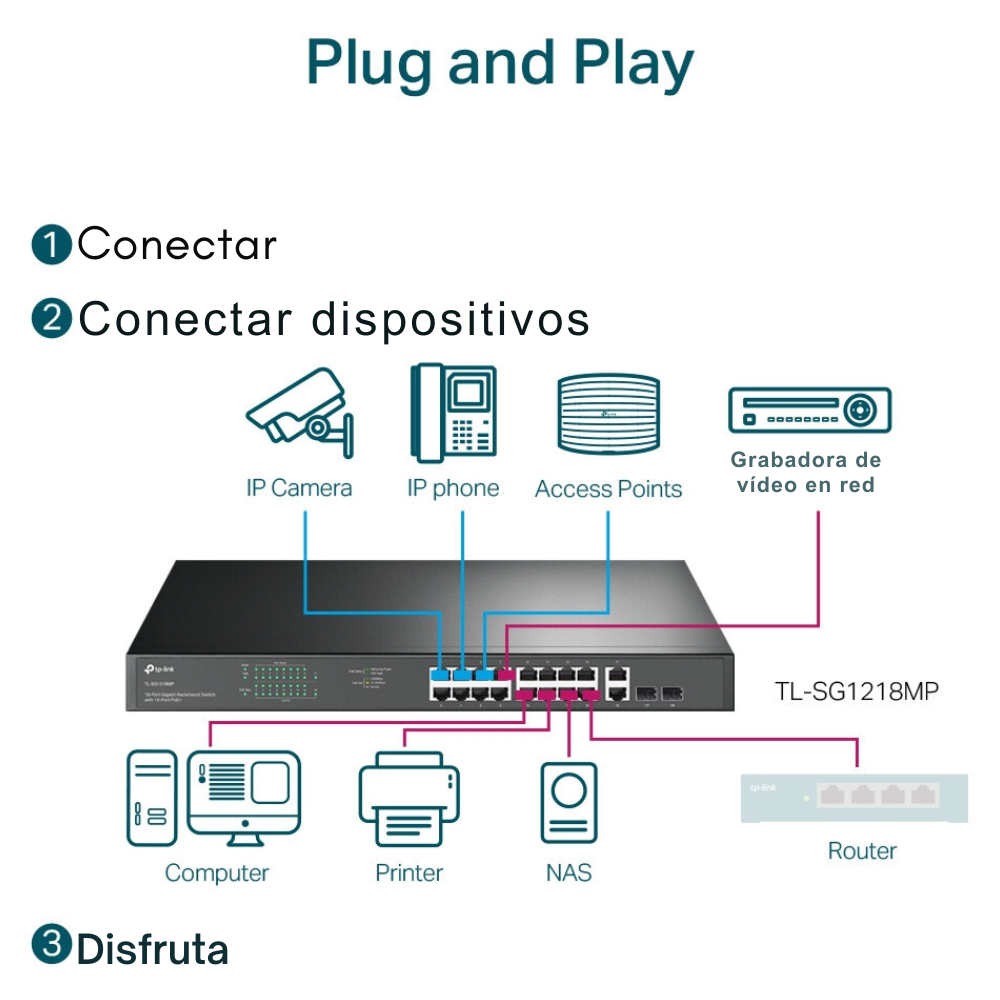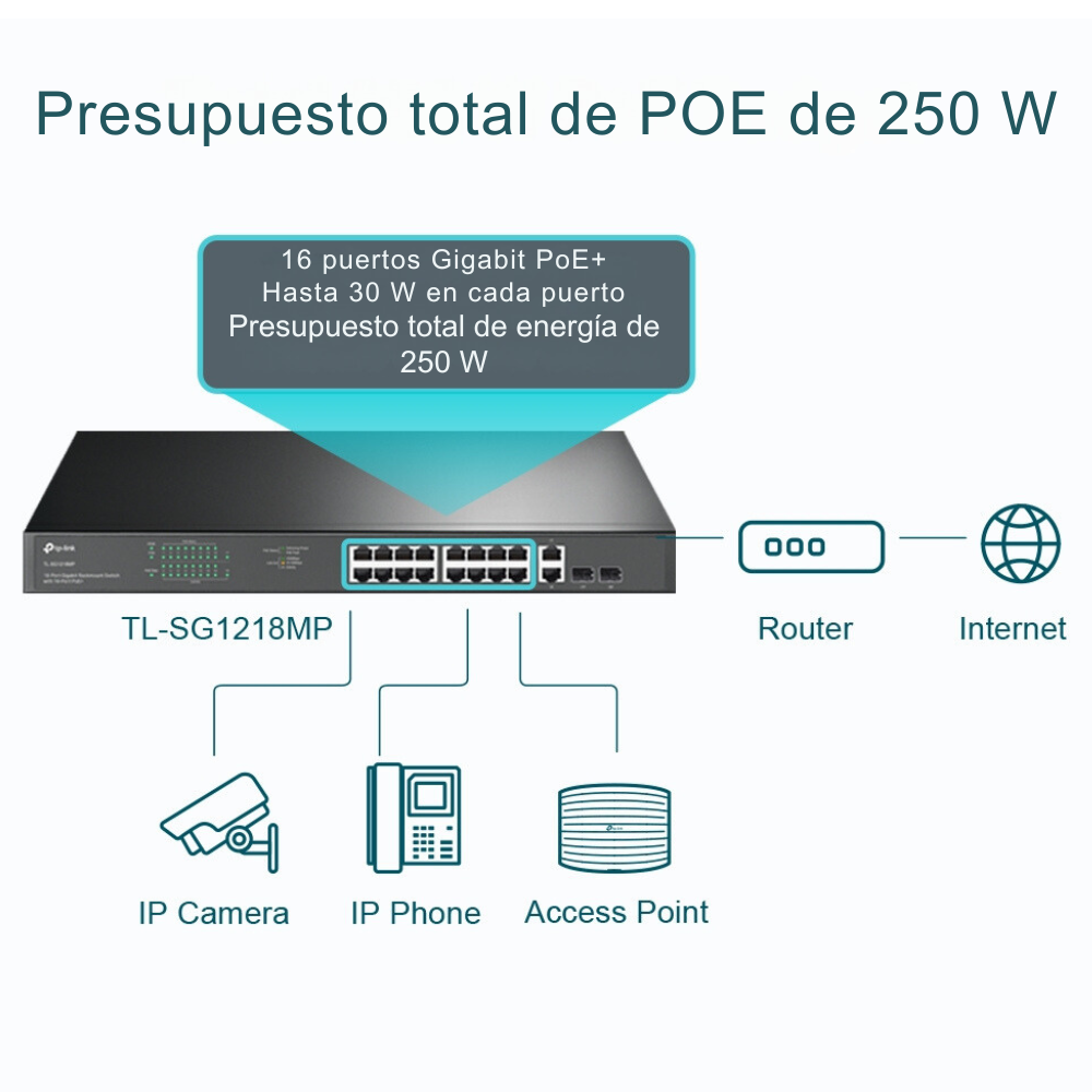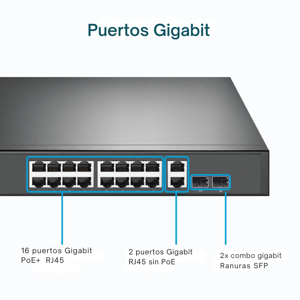 • PoE+ de alta capacidad: Alimenta y conecta hasta 16 dispositivos como cámaras IP, puntos de acceso y teléfonos VoIP sin necesidad de cableado eléctrico adicional.